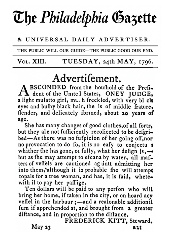 In the meantime, I spent the first day of Black History Month at the President’s House Site. I posted the “runaway slave” ad that Frederick Kitt, steward of the presidential household, placed in the Philadelphia Gazette & Universal Daily Advertiser offering a ten-dollar reward for the return of Oney Judge who “absconded from the household of the President of the United States.”