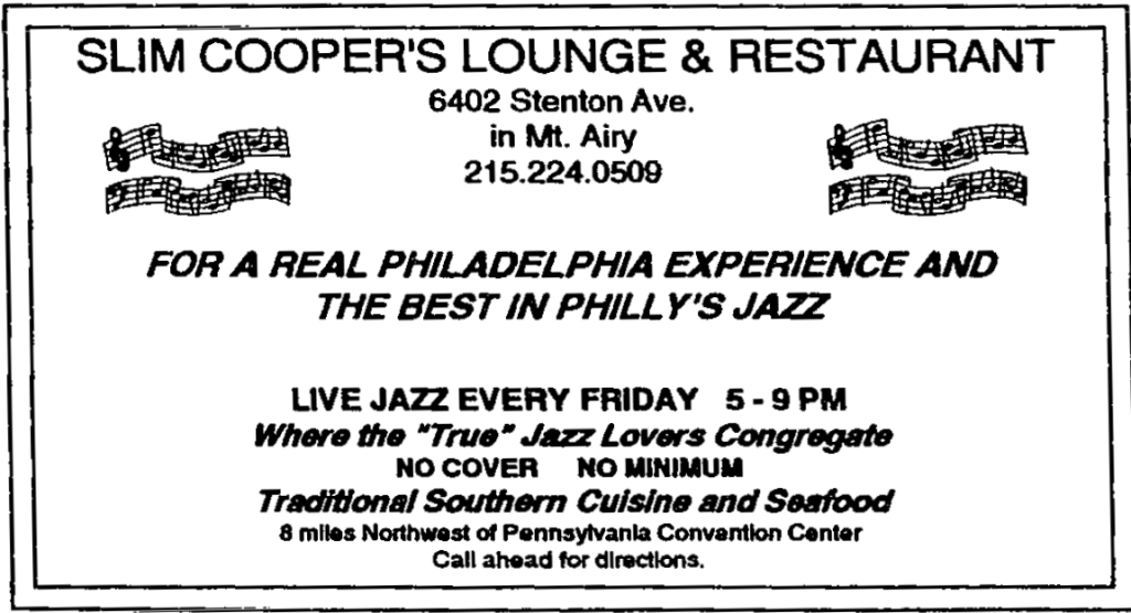 Slim and Barbara Cooper were the proprietors of Slim Cooper’s Lounge & Restaurant. The Philadelphia Tribune described it as “one of the nicer neighborhood jazz clubs.”