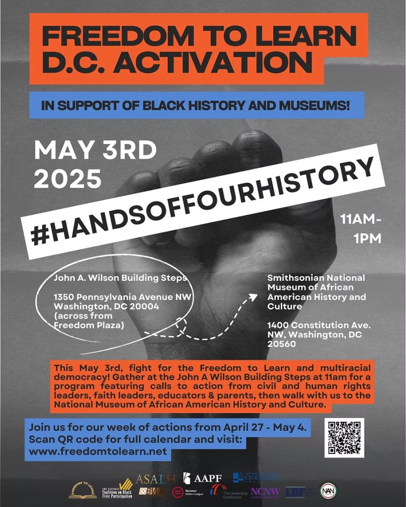 The activations include a #HandsOffOurHistory gathering in DC on Saturday, May 3, 2025.