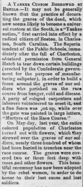 First observed in Charleston, South Carolina on May 1, 1865, thousands of African Americans, including the formerly enslaved, 54th Massachusetts Infantry Regiment, and 34th and 104th United States Colored Troops, were led by children as they gathered to honor 257 Union soldiers who were buried in a mass grave on Washington Race Course which was used as a Confederate prison camp.