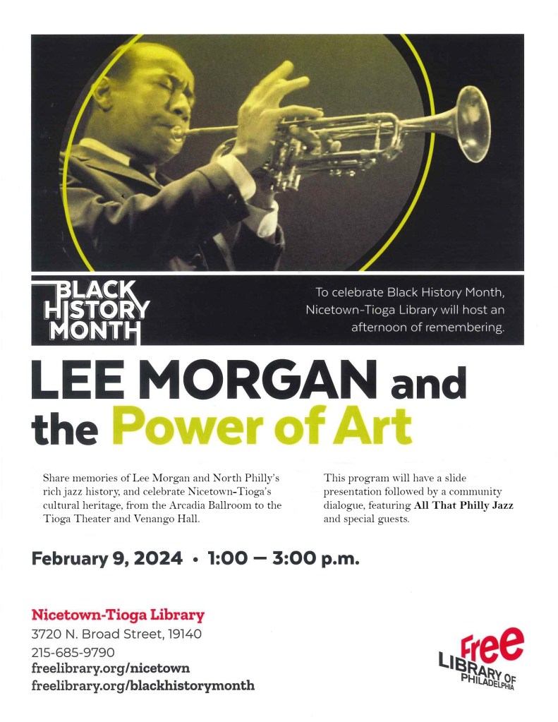 The Nicetown-Tioga Library and All That Philly Jazz are cohosting a community celebration of Lee Morgan and Tioga’s cultural heritage on Friday, February 9, 2024.
